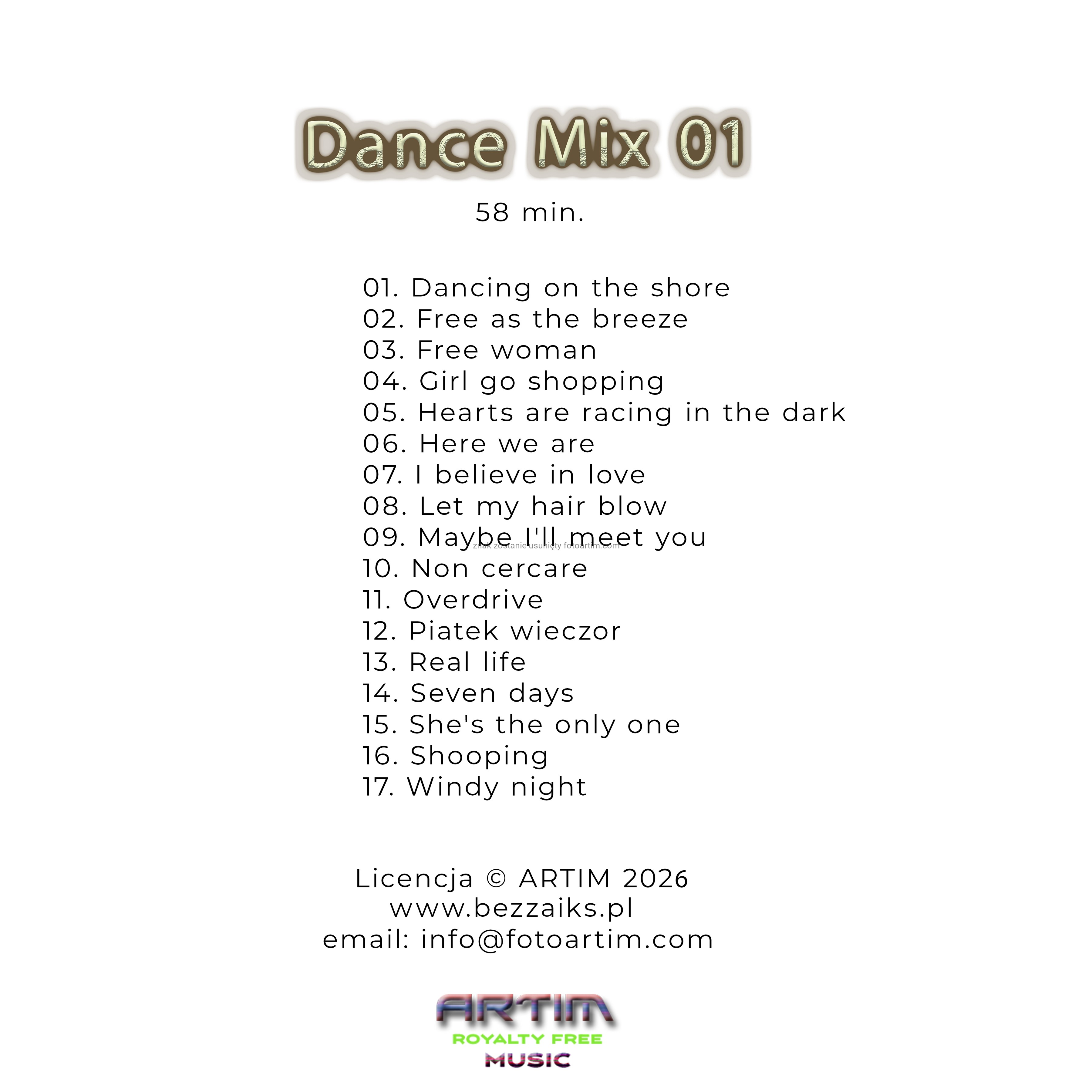 Rozkręć atmosferę w swoim lokalu lub projekcie dzięki albumowi Dance Mix 01. To 58 minut profesjonalnego brzmienia, które łączy nowoczesne produkcje z tanecznym rytmem. Idealny wybór dla miejsc, które potrzebują dynamicznej muzyki bez zbędnych formalności i wysokich kosztów.